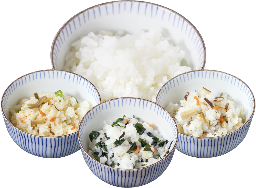 味付けは白飯・わかめ・きのこ・五目の4種類